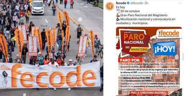 Fecode convoca un paro nacional este jueves 30 de octubre en Colombia. Miles de docentes marcharán exigiendo transparencia en el manejo del Fomag y soluciones a las deficiencias del sistema de salud que los afecta.