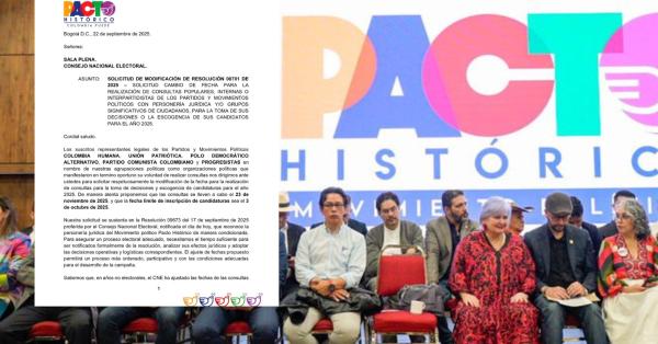 Este lunes, representantes legales de Colombia Humana, Unión Patriótica, Polo Democrático Alternativo, Partido Comunista Colombiano y Progresistas, presentaron formalmente la petición al CNE. La solicitud argumenta la necesidad de tiempo para asimilar la Resolución 09673 del 17 de septiembre de 2025, que les otorgó personería jurídica al Pacto Histórico, notificada el 22 de septiembre. Esta resolución genera la necesidad de una reorganización de los procesos internos.