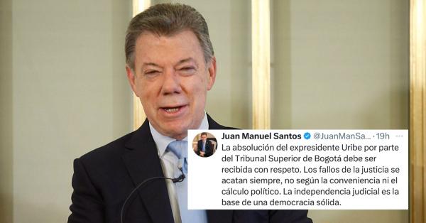 El Tribunal Superior de Bogotá absolvió al expresidente Álvaro Uribe Vélez en caso por soborno y fraude procesal. Juan Manuel Santos reaccionó en X, enfatizando el respeto a las decisiones judiciales y la independencia como pilar de la democracia. La decisión generó un amplio debate nacional.